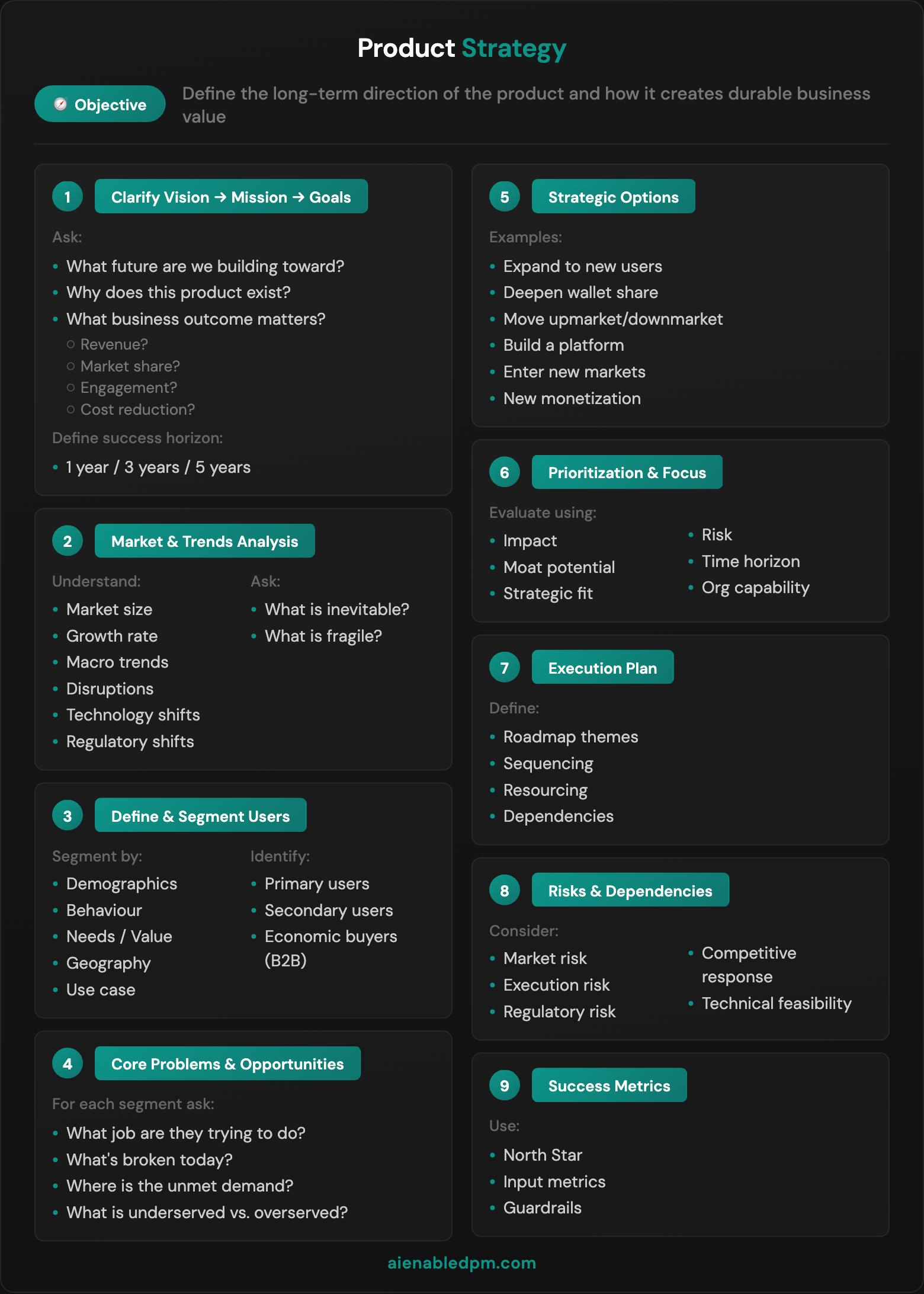 Step 1: Clarify Vision → Mission → Goals Start by anchoring on the “why.” Ask - What future are we building toward? Why does this product exist? What business outcome matters - revenue, market share, engagement, or cost reduction? Then define success horizons - what does good look like at 1 year, 3 years, and 5 years? A vision without a timeline is fantasy. A goal without a vision is a task.