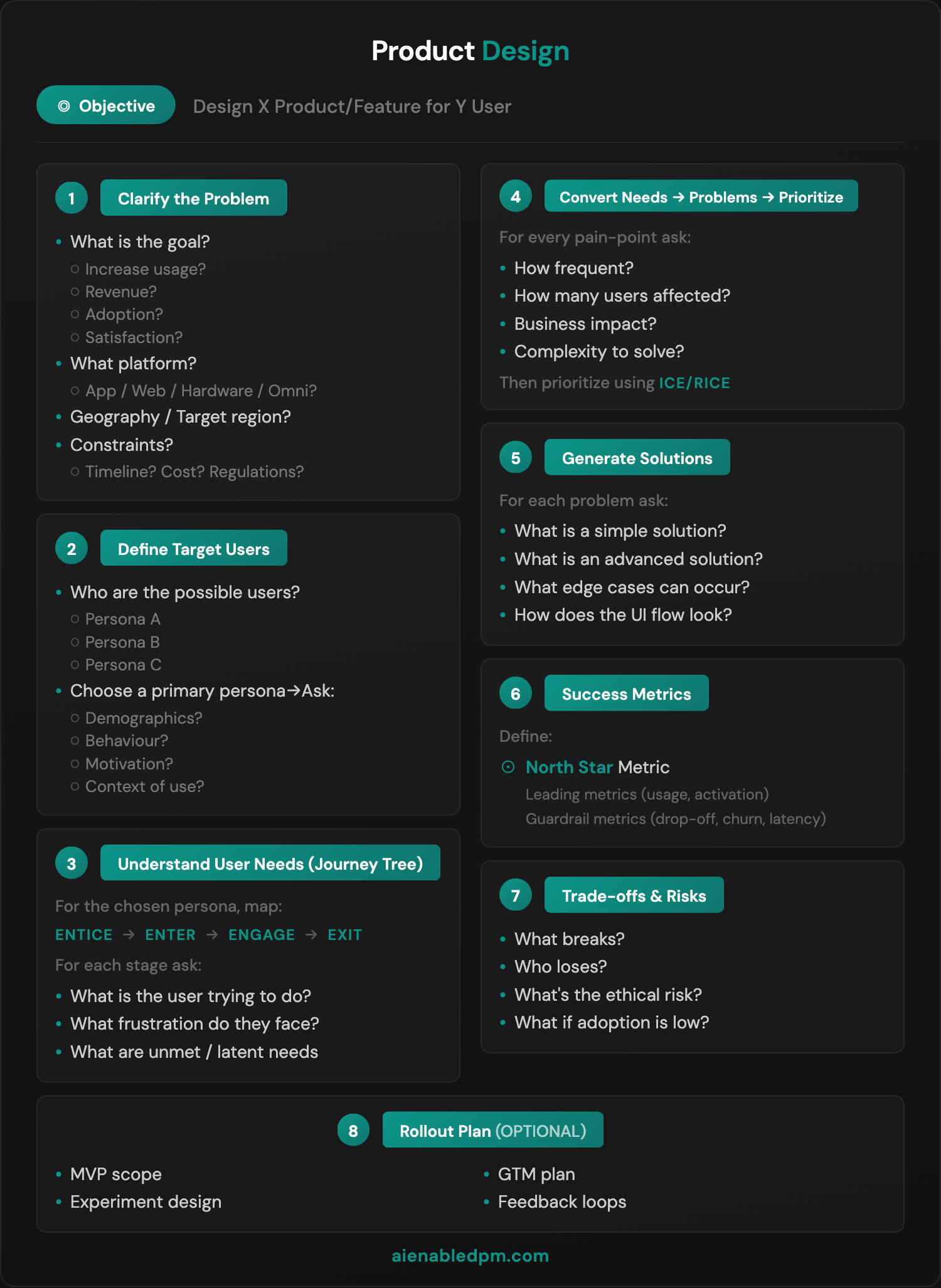 Step 6: Success Metrics Define your North Star metric, leading metrics (usage, activation), and guardrail metrics (drop-off, churn, latency).