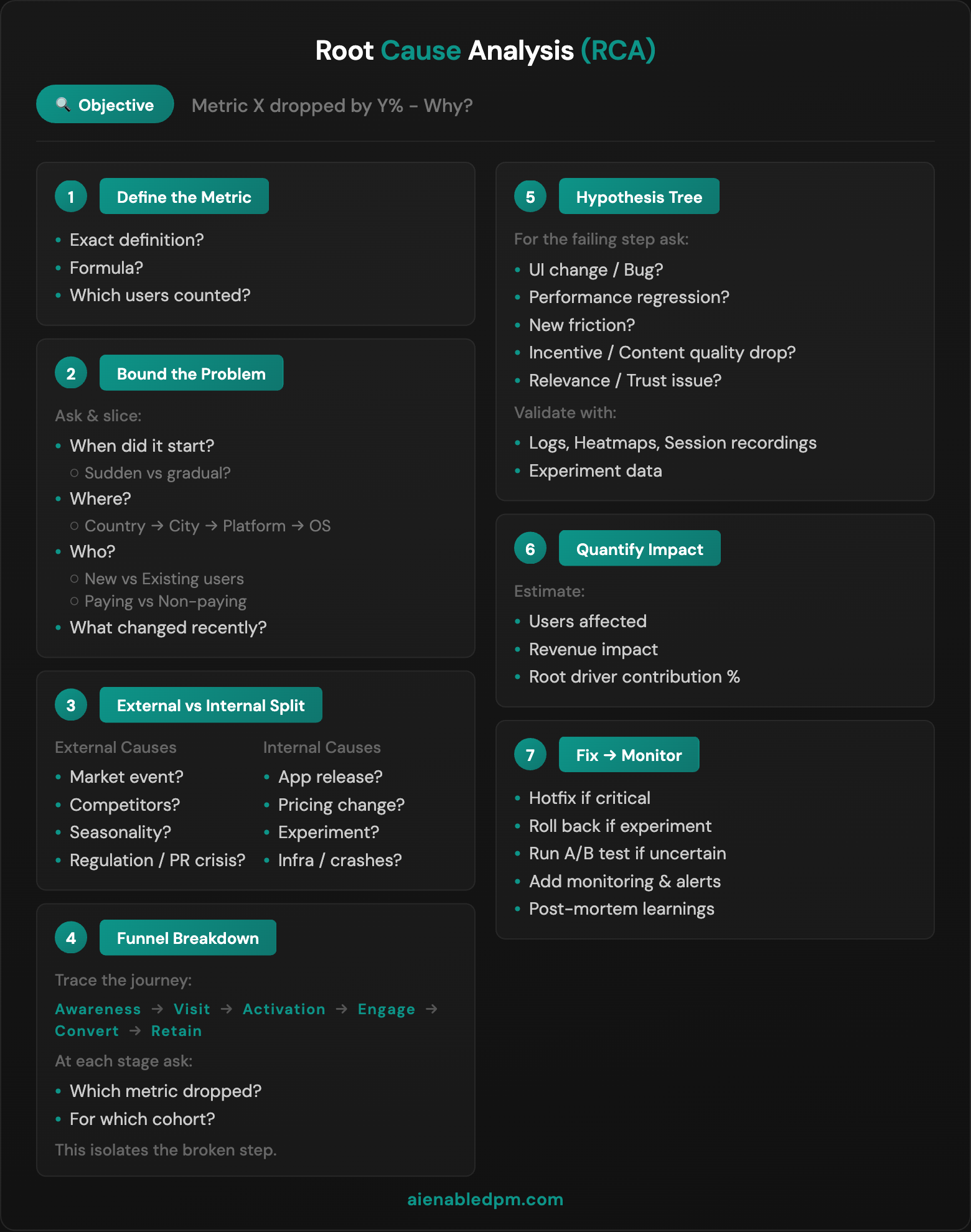 Step 3: External vs. Internal Split Categorize potential causes. External causes include market events, competitor moves, seasonality, or regulatory/PR issues. Internal causes include app releases, pricing changes, experiments, or infrastructure problems.