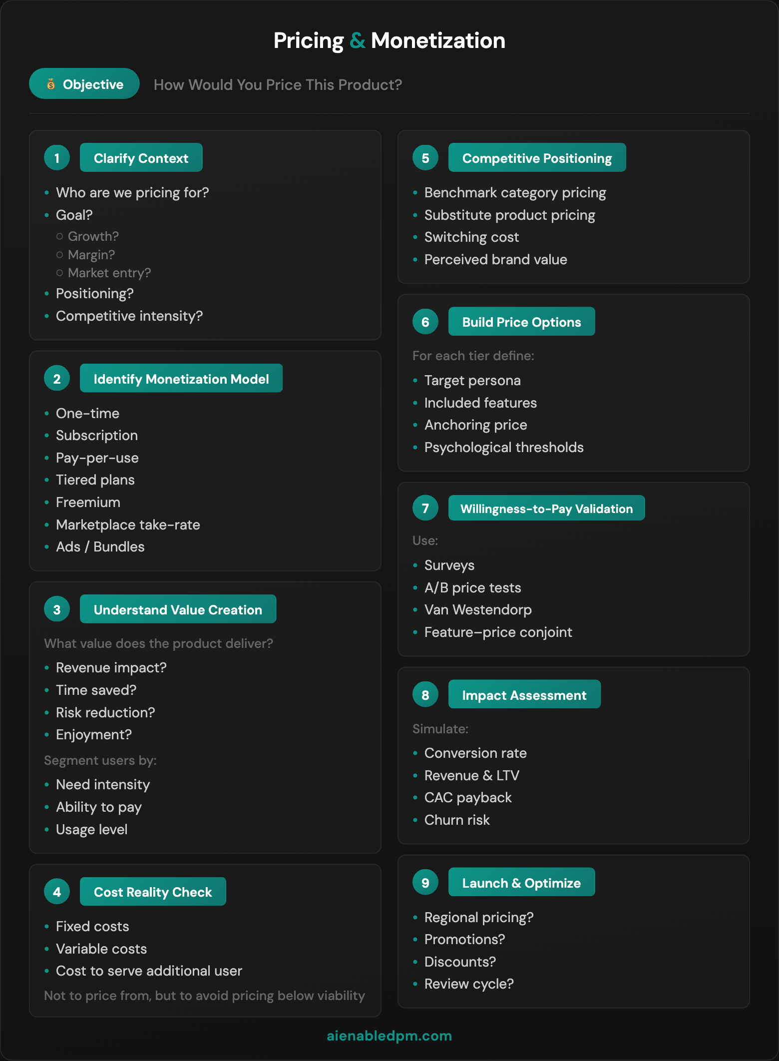 Step 1: Clarify Context Ask - Who are we pricing for? What’s the goal - growth, margin, or market entry? What’s our positioning? How intense is competition?