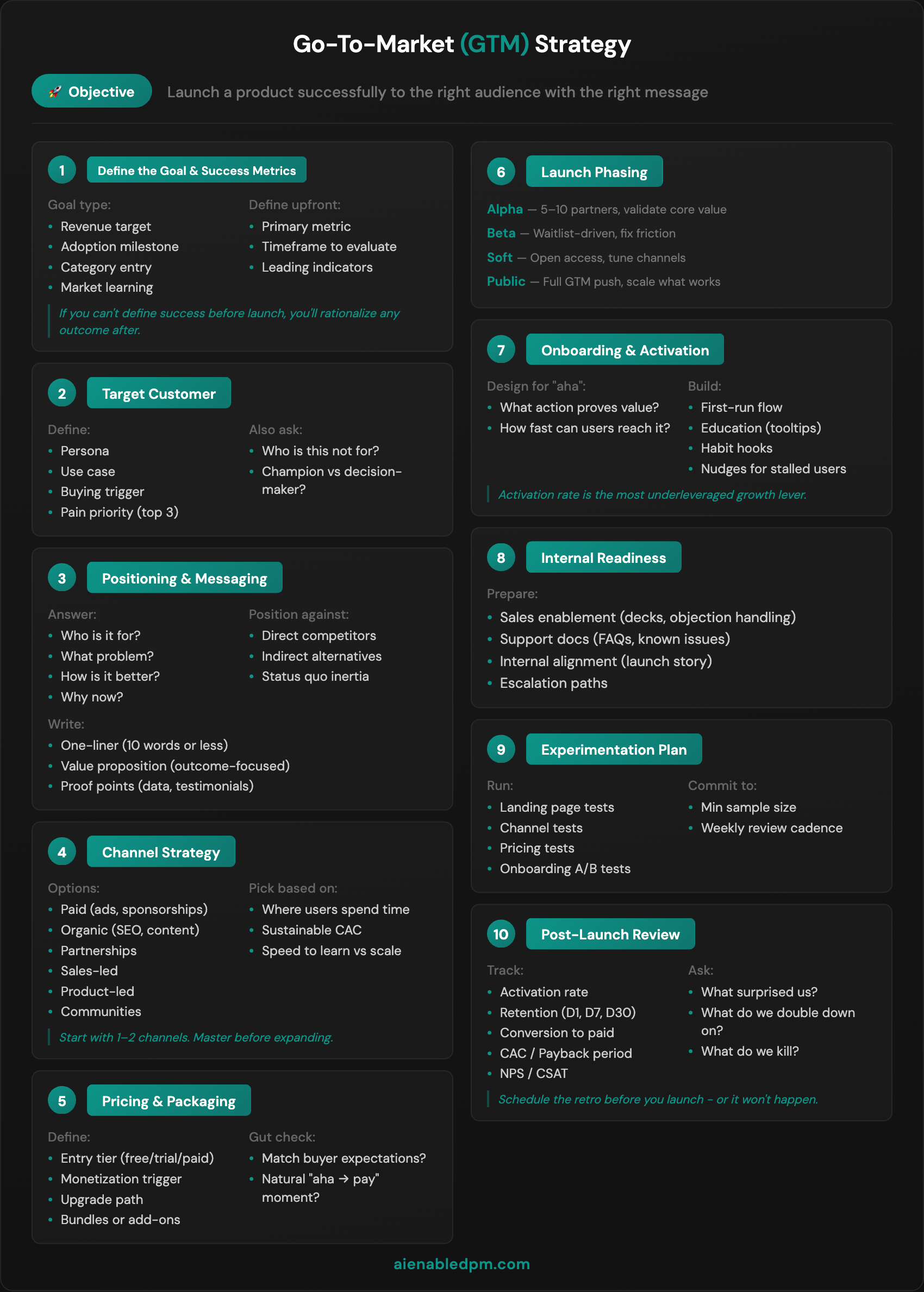 Step 10: Post-Launch Review Track activation rate, retention (D1, D7, D30), conversion to paid, CAC and payback period, and NPS/CSAT. Ask - What surprised us? What do we double down on? What do we kill? Schedule the retro before you launch - or it won’t happen.