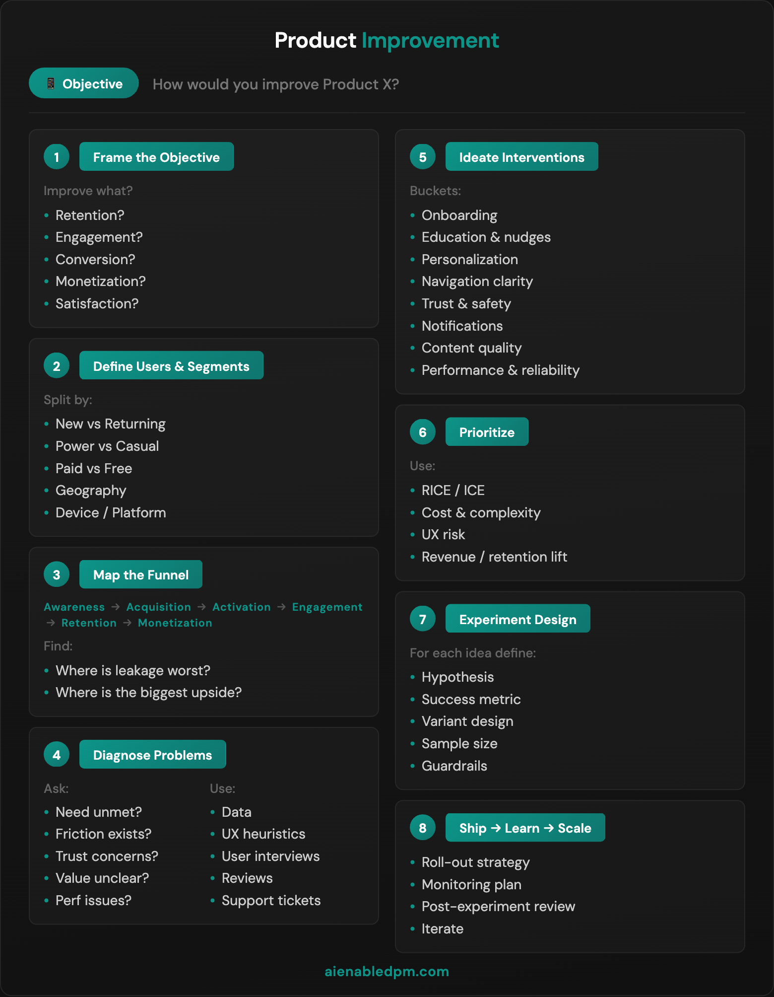 Step 1: Frame the Objective Improve what? Retention? Engagement? Conversion? Monetization? Satisfaction? Get specific.