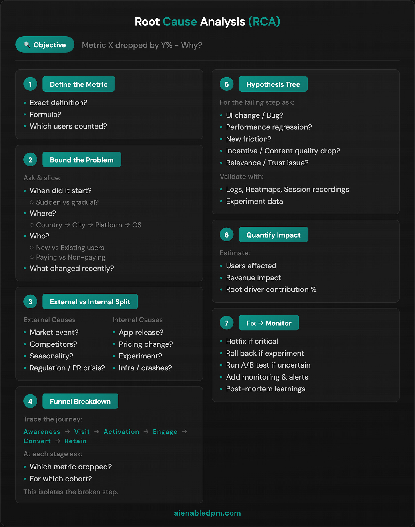 Step 1: Define the Metric Start by making sure you understand what you’re measuring. Ask about the exact definition, the formula behind it, and which users are counted. A “DAU drop” means different things if it includes bots vs. verified users.