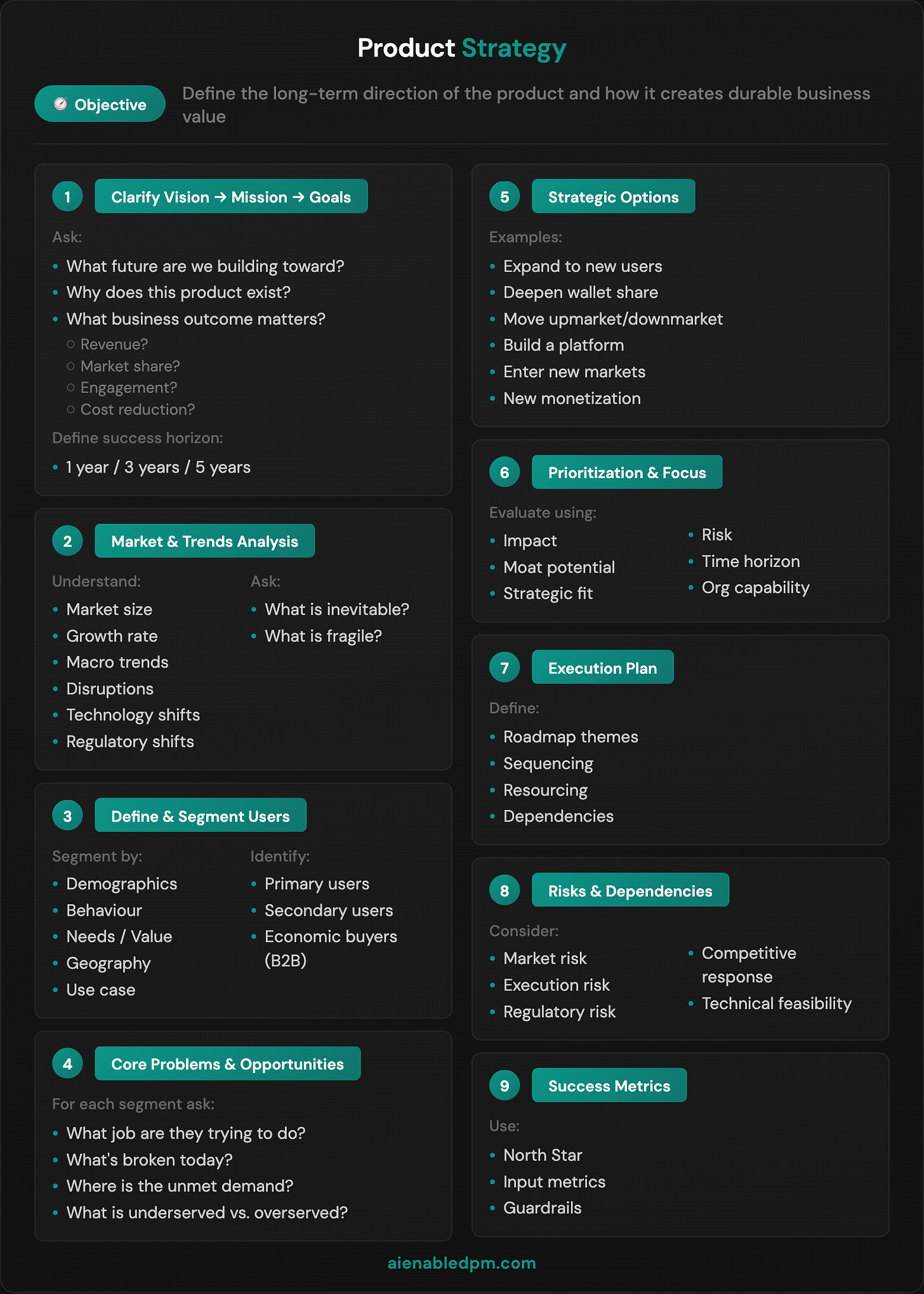 Step 1: Clarify Vision → Mission → Goals Start by anchoring on the “why.” Ask - What future are we building toward? Why does this product exist? What business outcome matters - revenue, market share, engagement, or cost reduction? Then define success horizons - what does good look like at 1 year, 3 years, and 5 years? A vision without a timeline is fantasy. A goal without a vision is a task.